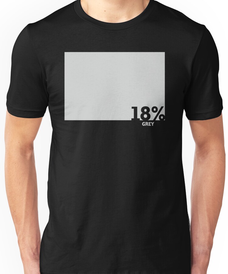 from the Artist: Unisex T-Shirt. *This is the first and the _original_ ‘18% Grey’ shirt. It has now been copied on a few other sites by a handful of thieving idiots. Don’t buy their cheap imitations – I have the original, dated, artwork.*… gripe over! 😉 This one’s for all you digital photographers out there (I think you’re the only ones that’ll get it!) For you none digital photographers; it’s to do with setting the exposure in their highly complicated cameras…. or something like that. *PLEASE NOTE: Accuracy of Grey not guaranteed – it’s just a bit of fun! ;-)* *IF YOU LIKE THIS you might like these…* “!http://ih0.redbubble.net/work.7780786.1.fig,creme,mens,fbfbfb.leica-liker-v3.jpg!”:http://www.redbubble.com/people/naf4d/t-shirts/7780786-leica-liker “!http://ih1.redbubble.net/work.4270512.1.fc,135×135,black.v3.jpg!”:http://www.redbubble.com/people/naf4d/t-shirts/4270512-1-color-checker-chart “!http://ih3.redbubble.net/work.4148198.2.fc,135×135,asphalt.v3.jpg!”:http://www.redbubbl