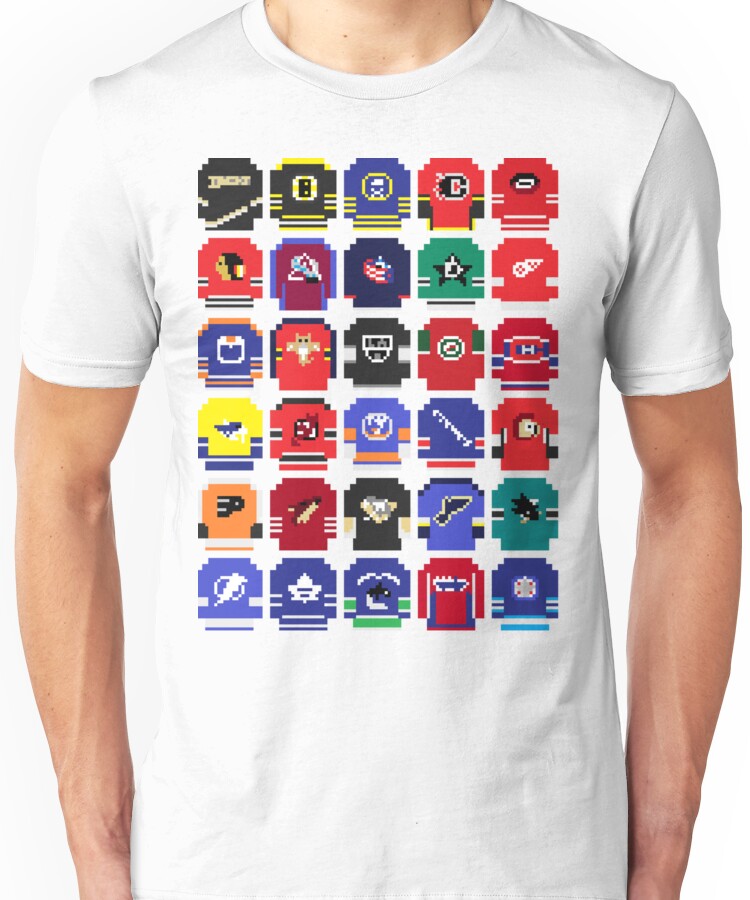 from the Artist: Unisex T-Shirt. Based on Al Creed’s world famous digital art piece, “8-Bit Hockey Jerseys,” this T-shirt is the perfect shirt for cheering on Local Sports Team!