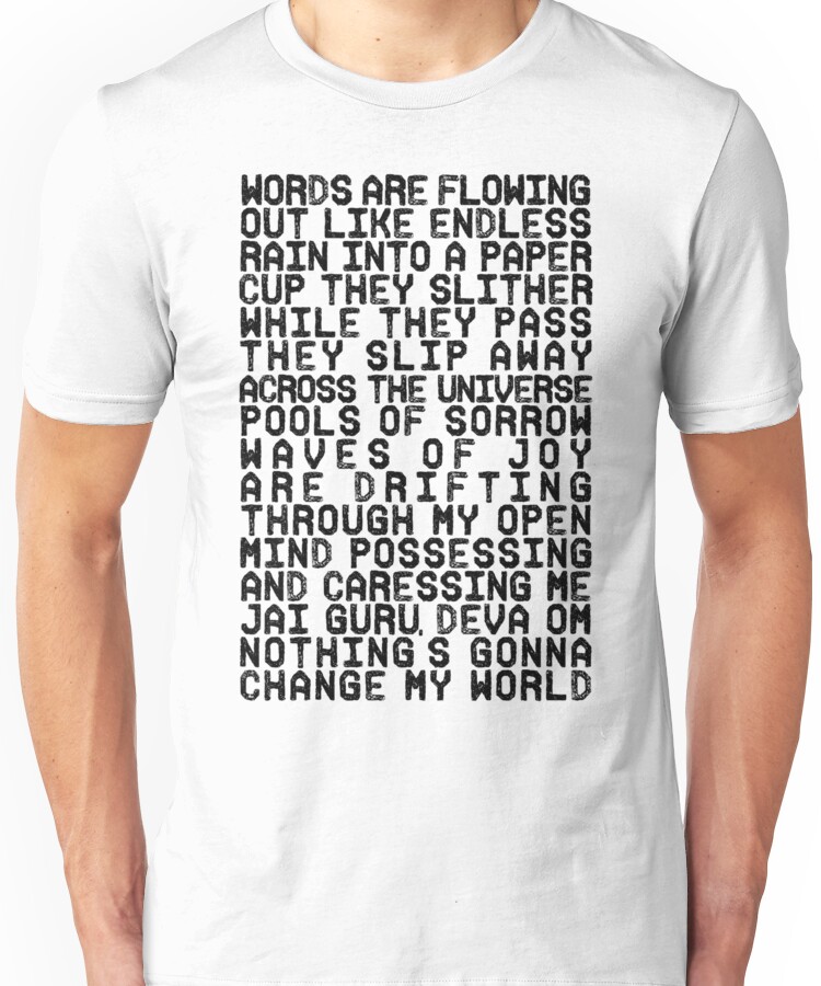 from the Artist: Unisex T-Shirt. From the must have Beatles album LET IT BE, this is my little homage to “Across The Universe” one of The Beatles most beautiful songs ever written… words are flying out like endless rain into a paper cup they slither while they pass they slip away across the universe pools of sorrow waves of joy are drifting through my open mind possessing and caressing me jai guru deva om nothing’s gonna change my world DESIGNED WITH LOVE by THE LOVE SHOP ?