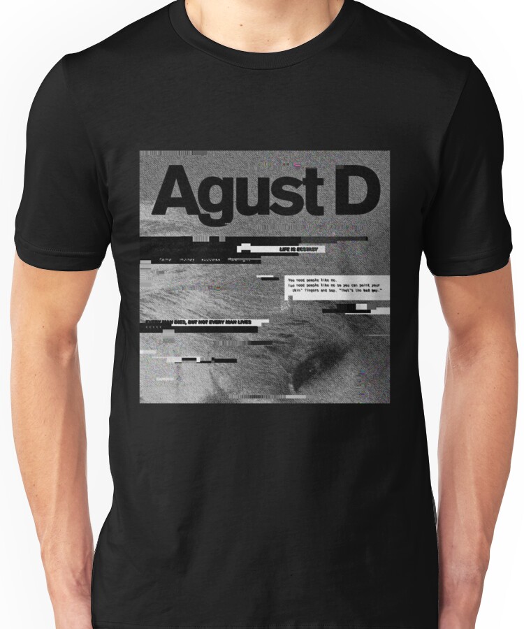 Ag(litch)ust D Unisex T-Shirt NOW $19.5 October 13, 2017 by admin Click Here to Purchase at: $19.5 from the Artist: Unisex T-Shirt. Agust D album art with a glitched effect