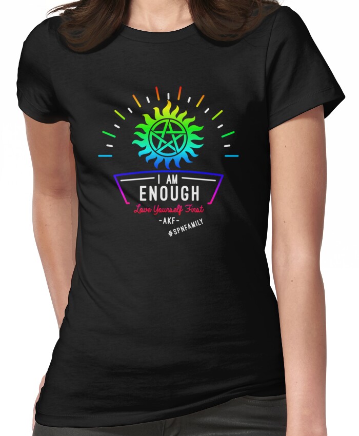 from the Artist: Women’s T-Shirt. Inspired by Supernatural Star Jared Padaleckis “Always Keep Fighting” Campaign – I Am Enough All credit, Admiration and my biggest Thanks go out to this one! Please believe did I had no intention of stealing his designs or use of words whatsoever! All I had in mind was this strong feeling did I want to help spreading his strong and wonderful messages! Because I remember getting this bracing and Encouraging feeling wearing one of his campaigns shirts and I want even more people to be able to feel this kind of support in Their Lives!