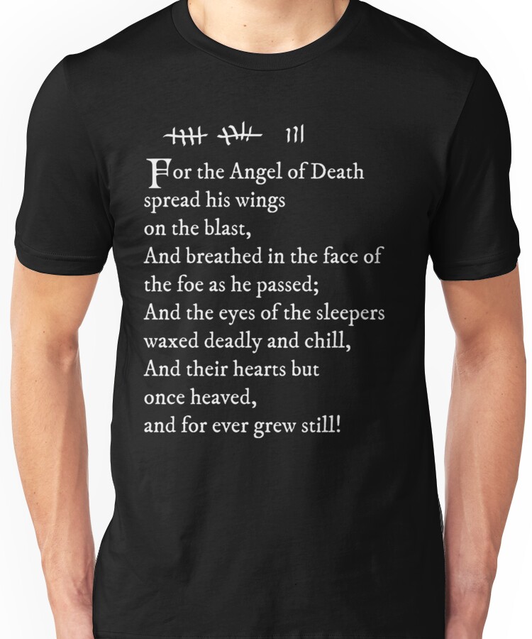 from the Artist: Unisex T-Shirt. Inspired by Pam Poovey’s tattoo in Archer. It’s an excerpt from the poem “The Destruction of Sennacherib” by Lord Byron: “For the Angel of Death spread his wings on the blast, And breathed in the face of the foe as he passed: And the eyes of the sleepers waxed deadly and chill, And their hearts but once heaved, and for ever grew still!” Alternate version available with “black text”:http://www.redbubble.com/people/jandii/works/9226606-archer-pams-tattoo-lord-byron-poem-black-text