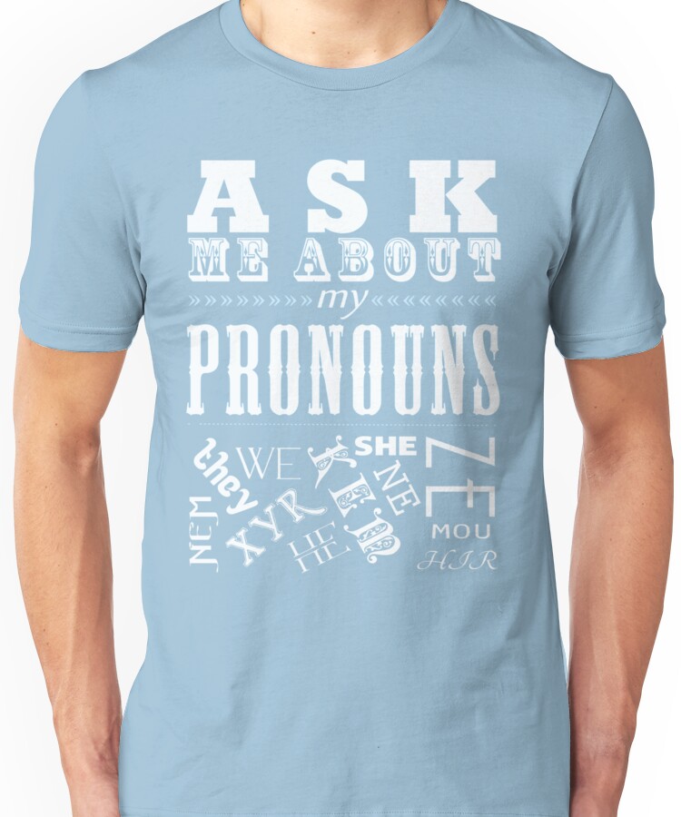from the Artist: Unisex T-Shirt. Are you a xym, a they, a she, a ze, or something else all together? Introduce the topic of gender binarism and break down those barriers! Gender freedom for all! If you dont see your pronouns here, please let me know and I will make a design with your pronouns in it, but please be sure to also check out my other designs as well!