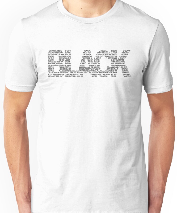 from the Artist: Unisex T-Shirt. Inspired by, in my opinion, the most beautiful song ever written. The lettering of the word BLACK is made up of the lyrics for the song “Black” by Pearl Jam. If you want to see the lyrics, go here: http://www.azlyrics.com/lyrics/pearljam/black.html The lyrics are quite readable when printed in this size – I have made a one of for myself. ______________________________ Scan QR code with “WALNUT app”:https://itunes.apple.com/au/app/walnut/id560843785?mt=8 to visualise artwork in your home !https://chart.googleapis.com/chart?chs=84×84&cht=qr&chl=Wa47&choe=UTF-8&chld=L/0! !http://www.walnut-art.com/images/walnut_logo_with_name_small.png!:http://www.walnut-art.com QR code: *Wa47* ______________________________