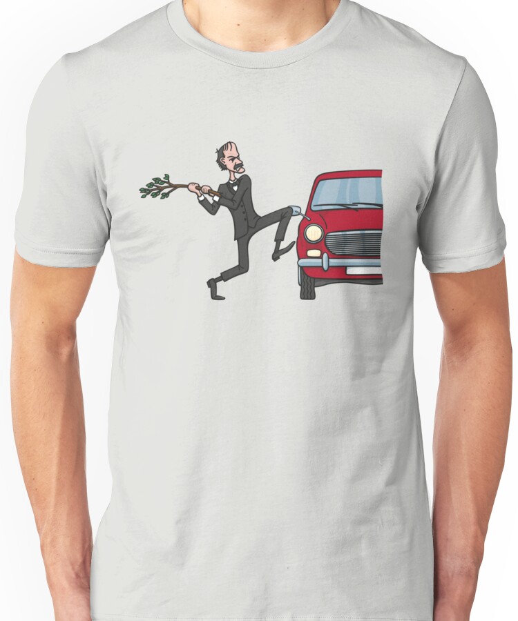 from the Artist: Unisex T-Shirt. Right! Don’t say I didn’t warn you. I’m going to give you a damn good thrashing! Basil Fawlty at his most angry, and nobody gets angrier than Basil. Also available on stickers. “!http://ih2.redbubble.net/image.11280466.9367/fc,135×135,white.jpg!”:http://www.redbubble.com/people/doodledojo/works/8329367-basils-fury-stickers