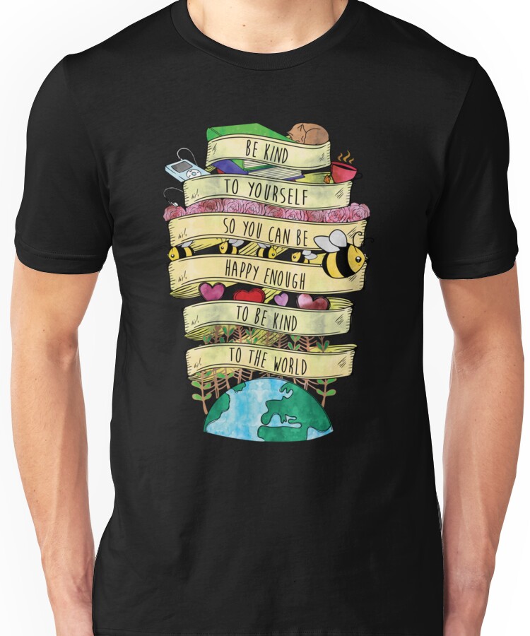 from the Artist: Unisex T-Shirt. “Be kind to yourself so you can be happy enough to change the world” – Quote by Misha Collins. Color Print. All proceeds benefit Random Acts Dreams 2 Acts Nicaragua Project.