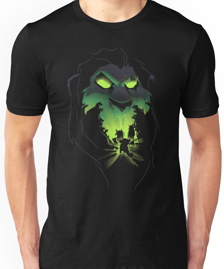 from the Artist: Unisex T-Shirt. Scar and his evil plans against Simba. From Disney, the movie “The Lion King” with hienna villains chasing Simba.