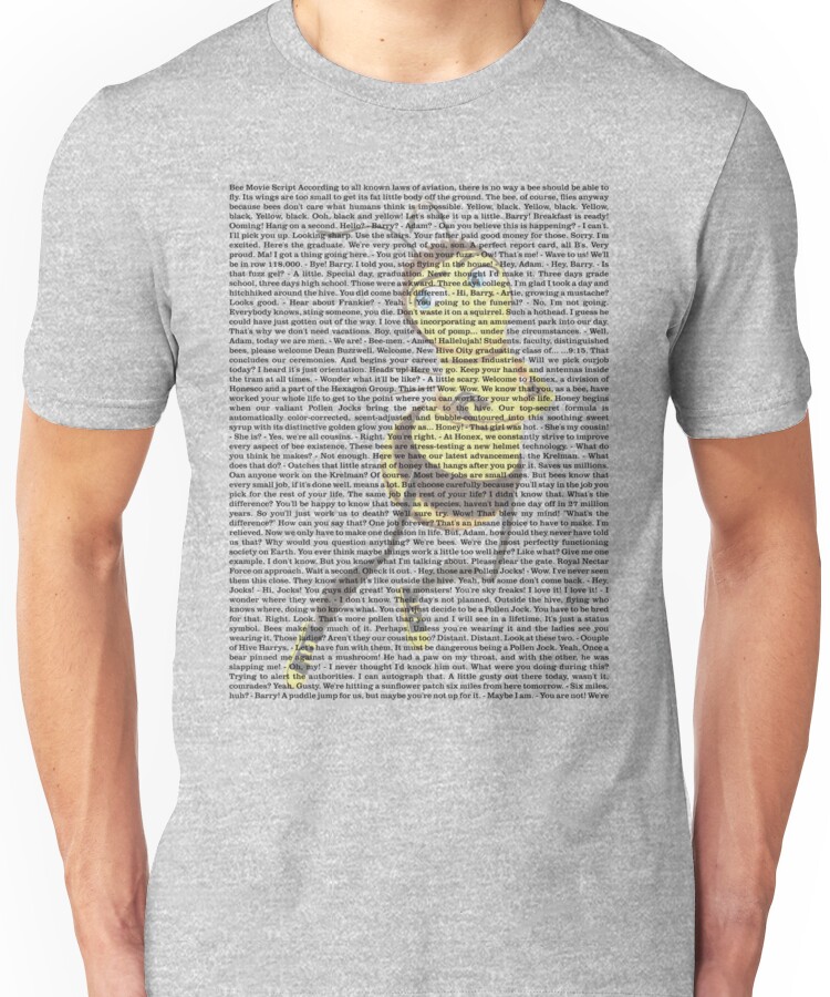 from the Artist: Unisex T-Shirt. Bee Movie Script According to all known laws of aviation, there is no way a bee should be able to fly. Its wings are too small to get its fat little body off the ground. The bee, of course, flies anyway because bees don’t care what humans think is impossible. Yellow, black. Yellow, black. Yellow, black. Yellow, black. Ooh, black and yellow! Let’s shake it up a little. Barry! Breakfast is ready! Ooming! Hang on a second. Hello? – Barry? – Adam? – Oan you believe this is happening? – I can’t. I’ll pick you up. Looking sharp. Use the stairs. Your father paid good money for those. Sorry. I’m excited. Here’s the graduate. We’re very proud of you, son. A perfect report card, all B’s. Very proud. Ma! I got a thing going here. – You got lint on your fuzz. – Ow! That’s me! – Wave to us! We’ll be in row 118,000. – Bye! Barry, I told you, stop flying in the house! – Hey, Adam. – Hey, Barry. – Is that fuzz gel? – A little. Special day, graduation. Never thought I’d make it. Thr