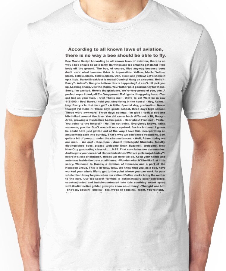 from the Artist: Unisex T-Shirt. Bee Movie Script According to all known laws of aviation, there is no way a bee should be able to fly. Its wings are too small to get its fat little body off the ground. The bee, of course, flies anyway because bees don’t care what humans think is impossible. Yellow, black. Yellow, black. Yellow, black. Yellow, black. Ooh, black and yellow! Let’s shake it up a little. Barry! Breakfast is ready! Ooming! Hang on a second. Hello? – Barry? – Adam? – Oan you believe this is happening? – I can’t. I’ll pick you up. Looking sharp. Use the stairs. Your father paid good money for those. Sorry. I’m excited. Here’s the graduate. We’re very proud of you, son. A perfect report card, all B’s. Very proud. Ma! I got a thing going here. – You got lint on your fuzz. – Ow! That’s me! – Wave to us! We’ll be in row 118,000. – Bye! Barry, I told you, stop flying in the house! – Hey, Adam. – Hey, Barry. – Is that fuzz gel? – A little. Special day, graduation. Never thought I’d make it. Three d