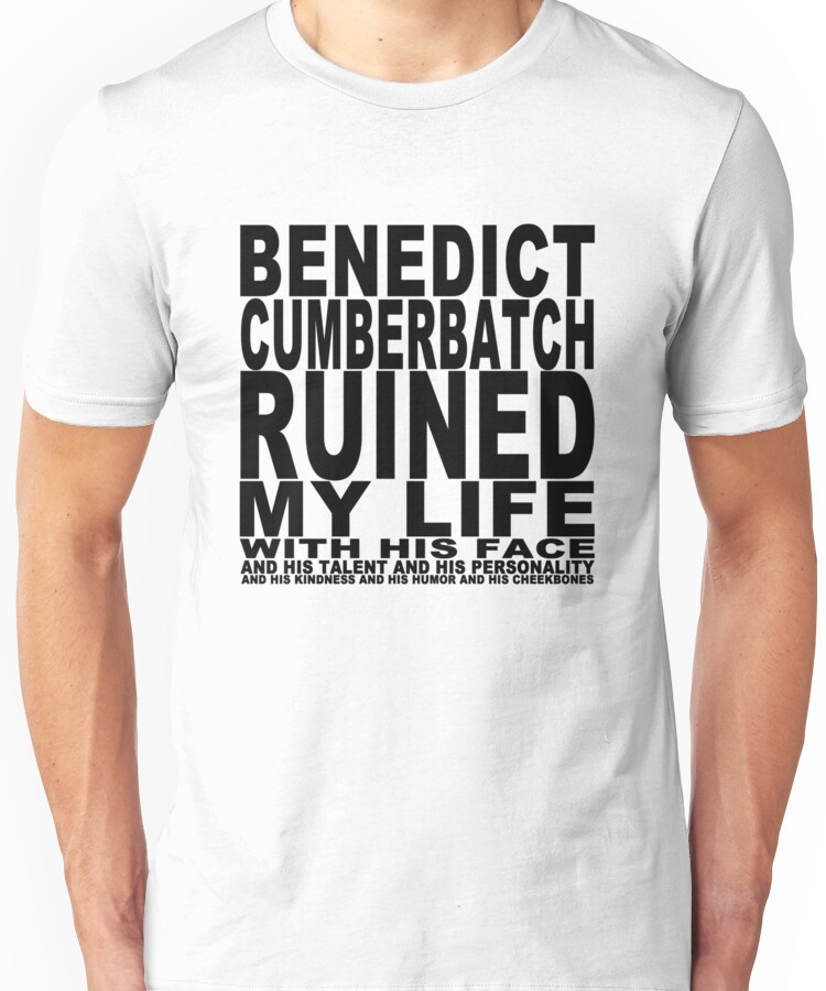 from the Artist: Unisex T-Shirt. Either because of his amazing personality or his gorgeous face, Benedict Cumberbatch has ruined all your expectations for other men. And you want the world to know it. This is the perfect shirt to show youre fanatic devotion to Mr. Cumberbatch, while also expressing your never ending sexual frustration. Its okay, we understand. We all love him too.