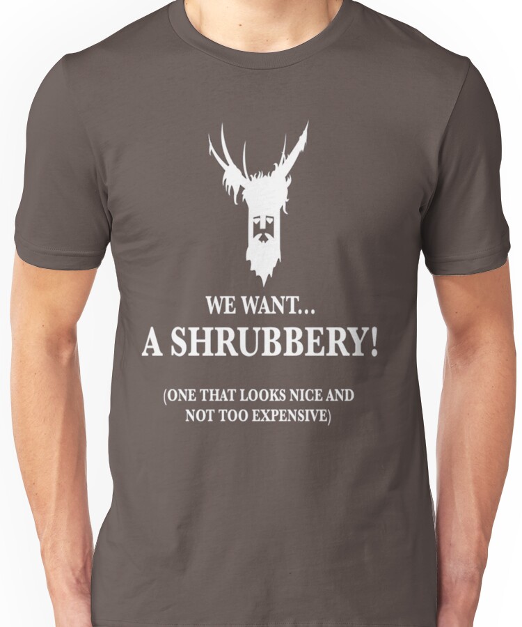 from the Artist: Unisex T-Shirt. A design from the classic scene of the (formerly known) knights of Ni. Now known as the knights of Icky icky ptang zoop boing! Enjoy.
