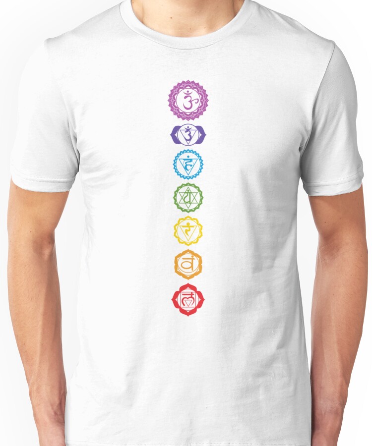 from the Artist: Unisex T-Shirt. Featuring the seven centers of the body in vivid color and symbolic detail, wear your chakras with pride, and remind everyone of their path to enlightenment.
