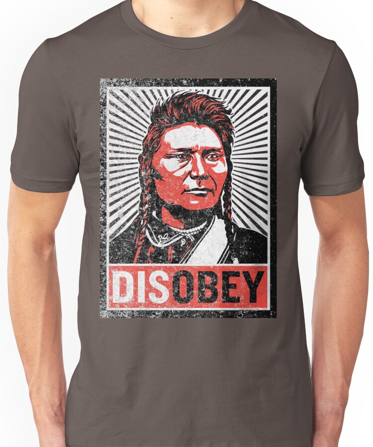from the Artist: Unisex T-Shirt. Countless broken treaties, genocide, enslavement, concentration camps, reservations, death marches… the stories of America’s native nations brutalized by government are just one chapter in the long history of state violence Here’s a t-shirt featuring the renegade, peacemaker, humanitarian, and adherent of civil disobedience Chief Joseph. The is print-also available in our poster section. There is possibly no better American example of the brutal nature of the state than the history of America’s native people.