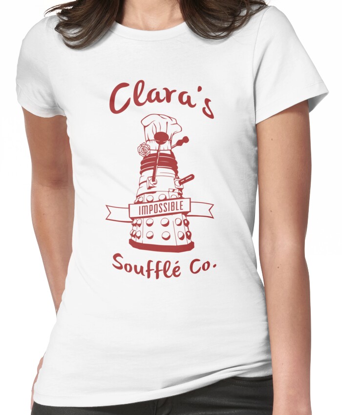from the Artist: Women’s T-Shirt. Clara’s Impossible Souffle Company, the best soufflés in all of time and space! They’re impossibly good! Also available as a white design to be printed on red and other dark colors. http://www.redbubble.com/people/beanafred/works/10893919-claras-impossible-souffl-company-white Inspired by the Doctor Who episode Asylum of the Daleks (7×1)