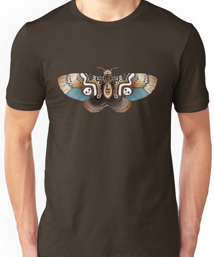 from the Artist: Unisex T-Shirt. A tiny mechanical moth, adorned with eyes and sculls .Inspired by steampunk. http://pixelmorph.com.au/word/2013/clockwork-moth/