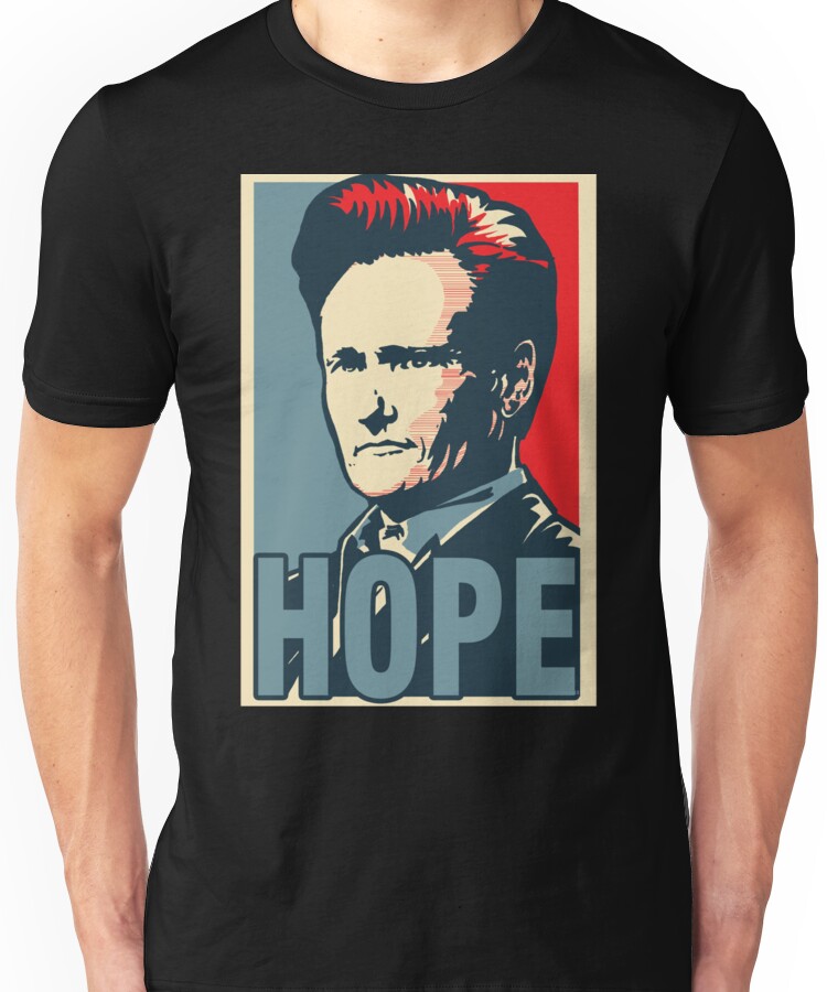 from the Artist: Unisex T-Shirt. HOPE for the best with this Conan OBrien inspired t-shirt which was designed for use on his show, and worn by Flobots AndyRok, then given to Conan off his back! NOW MORE THAN EVER, WE NEED HOPE!