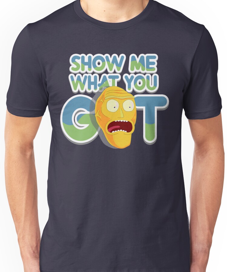 Cromulon AKA/Giant head, “Show me what you got” Rick and morty Unisex T-Shirt NOW $18.53 October 13, 2017 by admin Click Here to Purchase at: $18.53 from the Artist: Unisex T-Shirt.