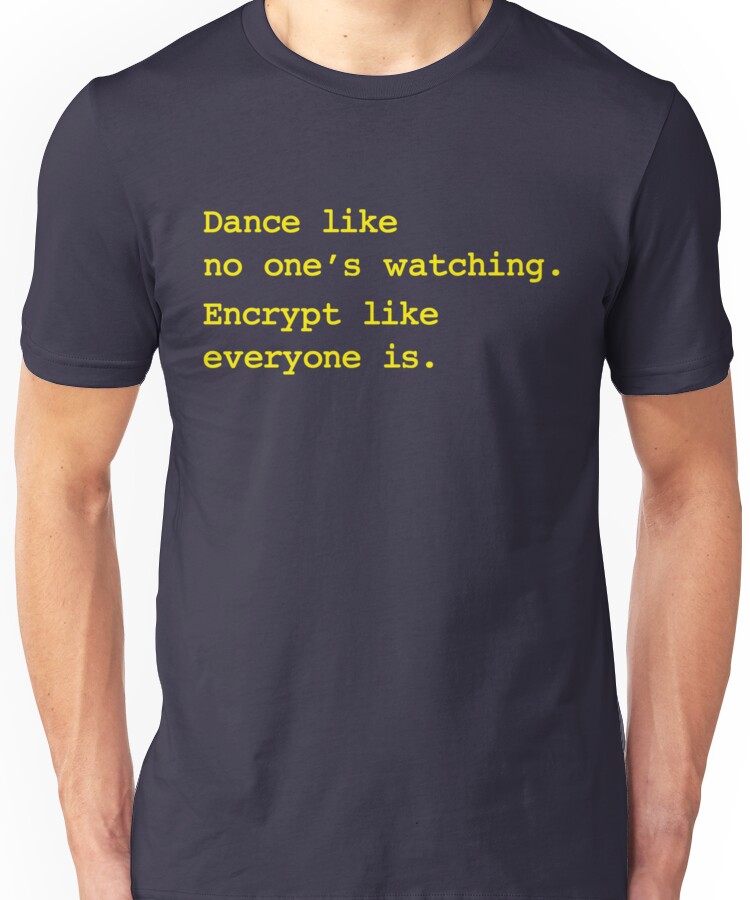 from the Artist: Unisex T-Shirt. Funny “Dance Like No One’s Watching Encrypt Like Everyone Is” T-Shirt. Let people know how to dance and how to encrypt with this funny computer data security shirt.