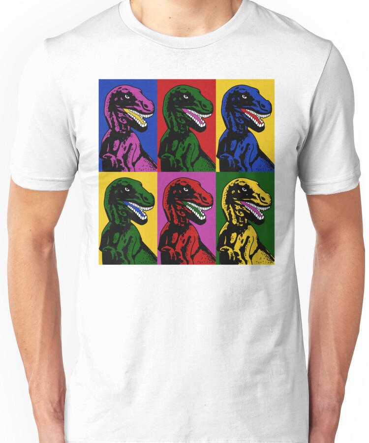 from the Artist: Unisex T-Shirt. Dinosaur Pop Art – an homage/immitation of the shirt Steven Spielberg can be seen wearing during the filming of Jurassic Park.