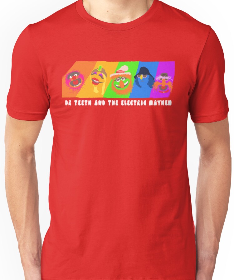 from the Artist: Unisex T-Shirt. Everybody’s favorite puppet rock band is given colorful representation in my design for Dr Teeth and the Electric Mayhem, inspired by their psychedelic appearance in THE MUPPET MOVIE (1979). Animal, Janice, Dr Teeth, Zoot, and Floyd each get their own piece of the rainbow!