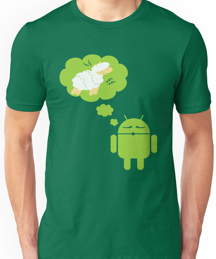 from the Artist: Unisex T-Shirt. A double nerd reference hat trick: inspired by the title of Phillip K Dick’s novel, “Do Androids Dream of Electric Sheep?” (which, on its own inspired the film, “Blade Runner”) with a modern DROID flair to it. Both the DROID and the Sheep were made shape by shape in order to give them that paper cutout look. *Last sale date 1/11/13* Also available with a white border for that iron-on decal vintage look: !http://ih0.redbubble.net/work.7565544.1.fig,creme,womens,fbfbfb.droid-dreaming-of-an-electric-sheep-iron-on-look-v3.jpg!:http://www.redbubble.com/people/anthonypipitone/t-shirts/7565544-droid-dreaming-of-an-electric-sheep-iron-on-look Up for voting on Qwertee: !http://www.qwertee.com/static/images/droid_mhb_500.jpg!:http://www.qwertee.com/product/droid-dreaming-of-an-electric-sheep/