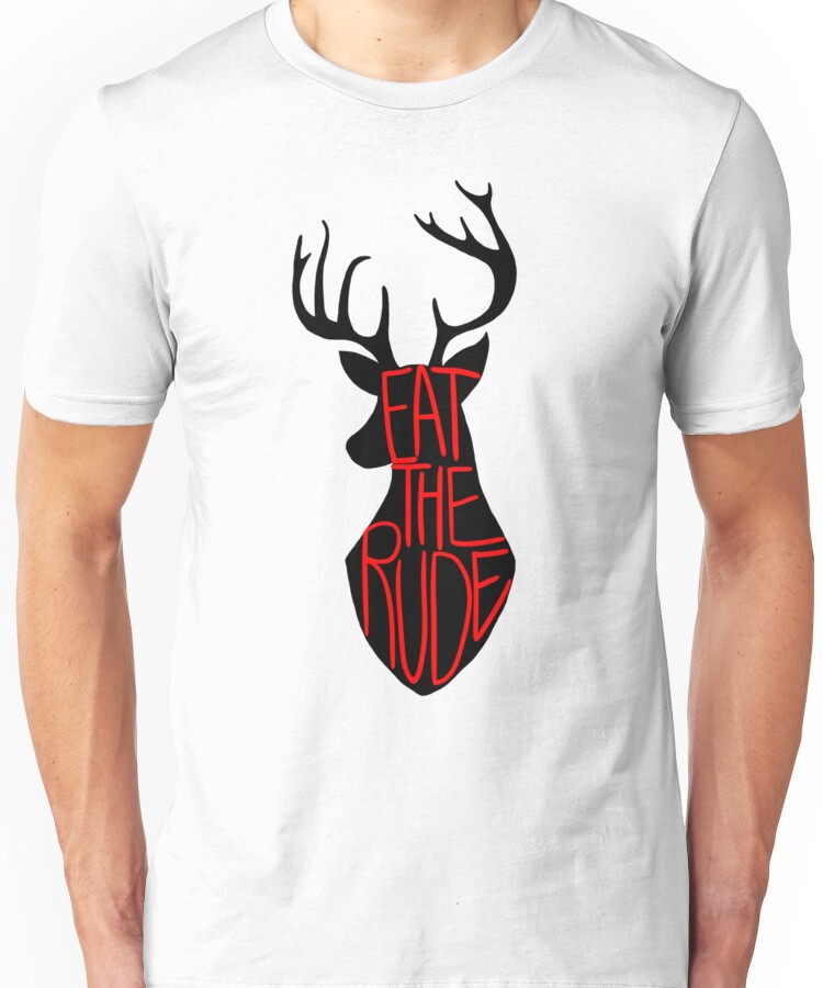 from the Artist: Unisex T-Shirt. When feasible, I prefer to eat the rude. Red text on black silhouette.