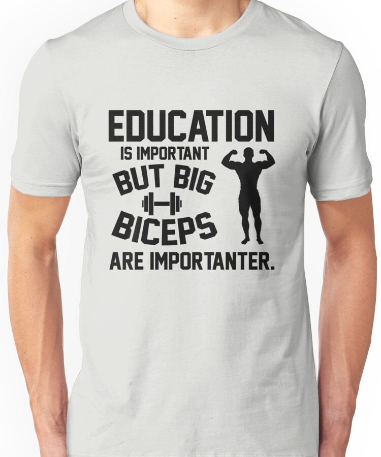 from the Artist: Unisex T-Shirt. Education is important. Big Biceps are importanter. Show everyone that you are addicted to crossfit, burpees, deadlift, pull ups, situps, workout, exercise, bodybuilding, gym, funny, quote, school,