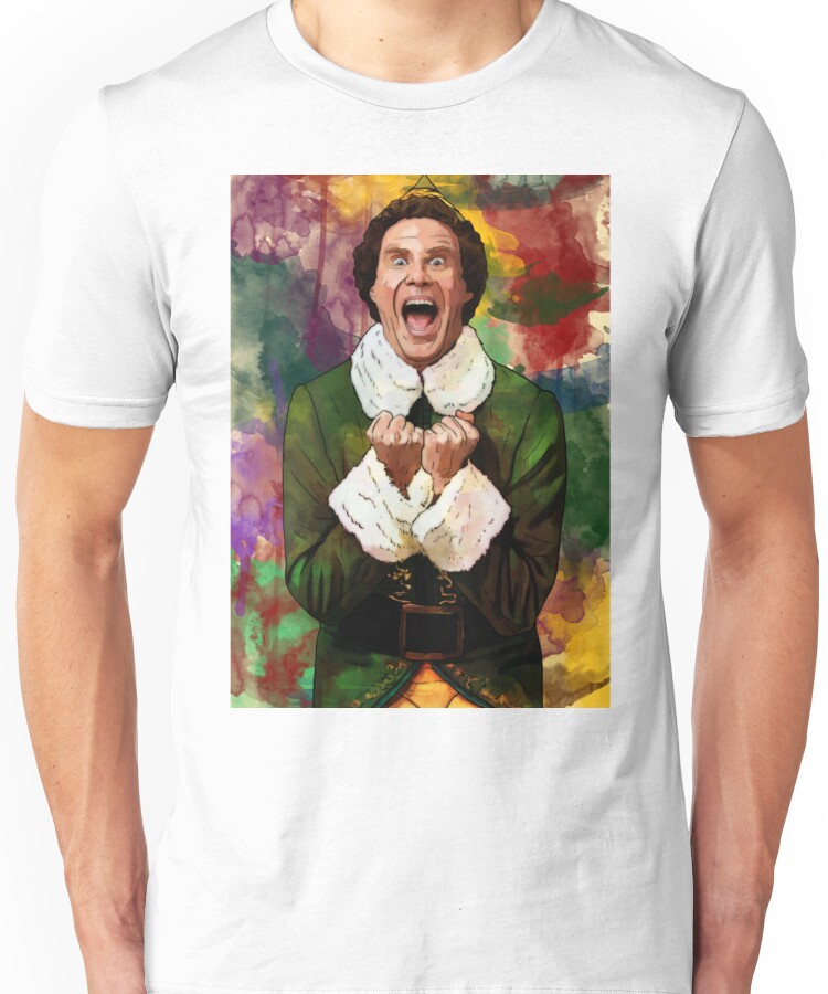 from the Artist: Unisex T-Shirt. “SANTA! OH MY GOD! SANTA’S COMING! I KNOW HIM! I KNOW HIM!” Illustration of Will Ferrell as Buddy from the movie Elf.