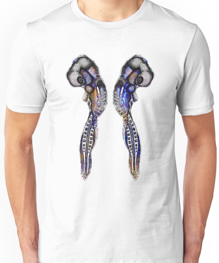 from the Artist: Unisex T-Shirt. As much as we all like to think humans are great and everything, the fact remains we all start out as tiny little squishy embryos…that look remarkably similar to a whole load of other creatures as embryos. This one was drawn from life, it’s a 48 hour old chick embryo. Ink & watercolour on paper, pngified for T-shirts.