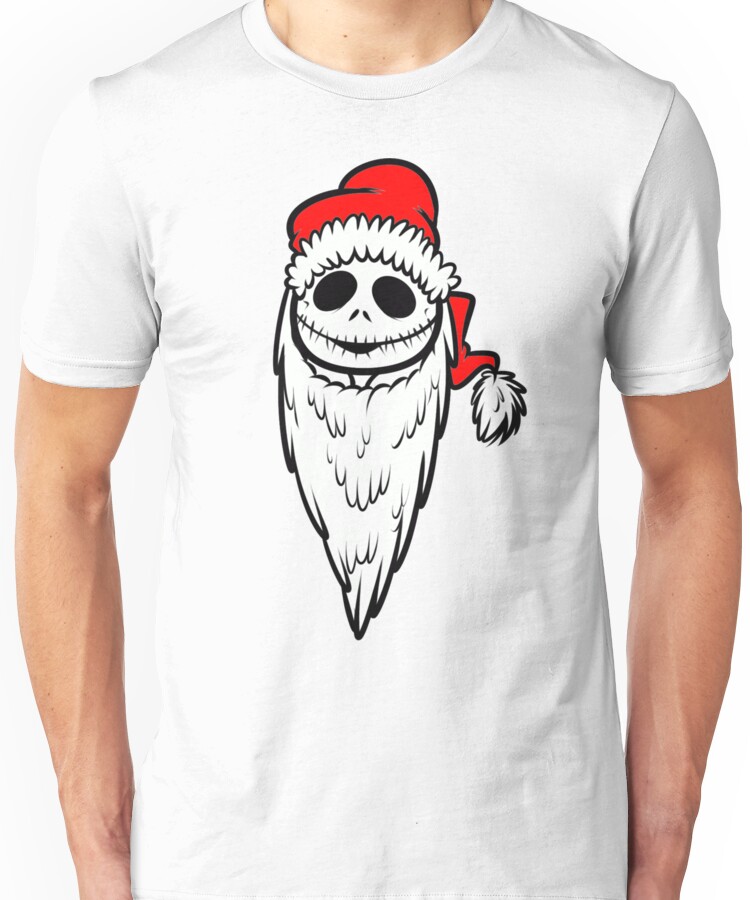 from the Artist: Unisex T-Shirt. Jack skellington wearing a father christmas hat, as seen in nightmare before christmas