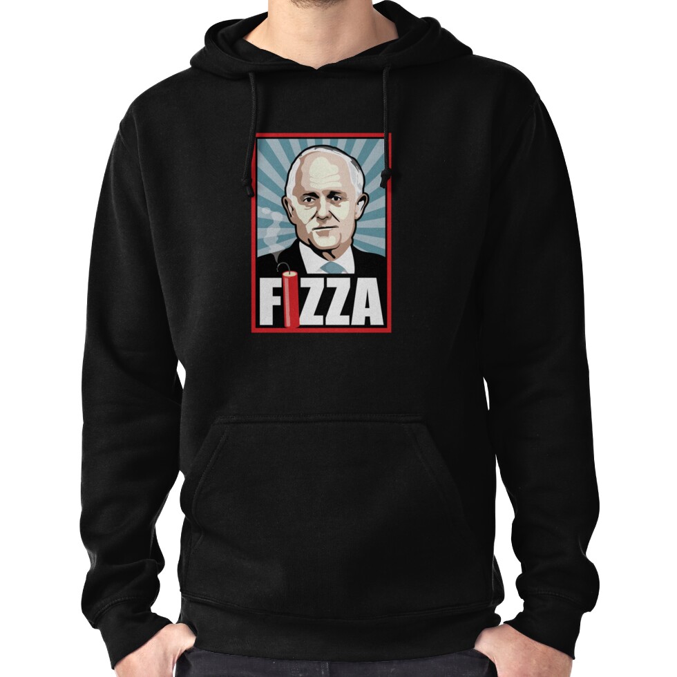 from the Artist: Hoodie (Pullover). Our new campaign reflects the massive turn around in fortunes from the god like status Turnbull enjoyed when he was elected by his party to replace Abbott. He was applauded as an articulate and intelligent replacement to someone who was a national and international embarrassment. Sadly the reality is quite different. He is a disappointment. The tag line “”FIZZA” is based on a comment by Paul Keating who described Turnbull as “…a bit like a big red bunger on cracker night. You light him up, there’s a bit of a fizz but then nothing nothing”.