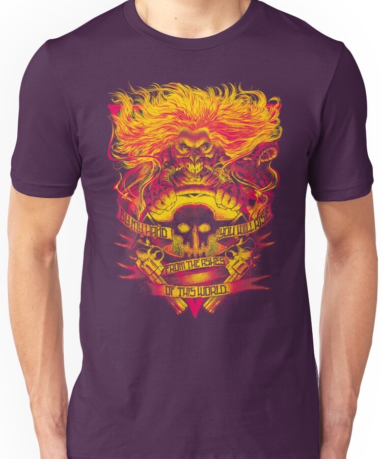 from the Artist: Unisex T-Shirt. “It is by my hand you will rise from the ashes of this world.” The world crumbled, and only the strong and resourceful would survive. Colonel Joe Moore died and rose from the ashes of the old world as Immortan Joe, leader of the War Boys, and escaping his grasp is no easy task, though Mad Max Rockatansky is sure as hell going to try.
