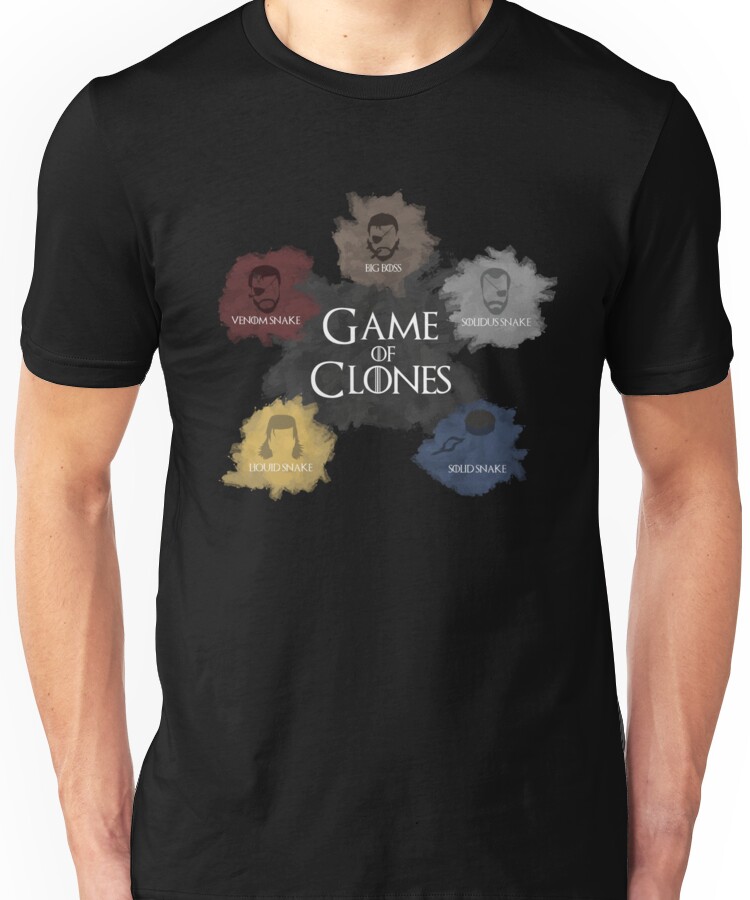 from the Artist: Unisex T-Shirt. Phantoms, Clones, Les Enfants Terribles. Who holds the throne, wins the Game of Clones. Your favorite snakes, in a new Metal Gear fan artwork!