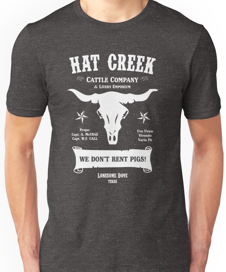 from the Artist: Unisex T-Shirt. !http://www.groatsworth.net/uploads/1/2/0/5/1205784/2580797_orig.jpg! Groatsworth – Privateer Clothing See our full collection at www.groatsworth.net Twitter: www.twitter.com/groatsworth Facebook: www.facebook.com/groatsworth ?Instagram: www.instagram.com/groatsworth Pinterest: www.pinterest.com/groatsworth Flickr: www.flickr.com/groatsworth “It ain’t dying I’m talking about – it’s living.” (Capt. Augustus McCrae) “I hate rude behaviour in a man. I won’t tolerate it.” (Capt. W. F. Call) Hat Creek Cattle Company by Groatsworth. Inspired by the 1985 Pulitzer Prize-winning novel by Larry McMurtry, and the epic TV miniseries, starring Robert Duvall and Tommy Lee Jones. !http://www.groatsworth.net/uploads/1/2/0/5/1205784/s868286354669376921_p177_i87_w640.jpeg! !http://www.groatsworth.net/uploads/1/2/0/5/1205784/5577111.jpg?1178!