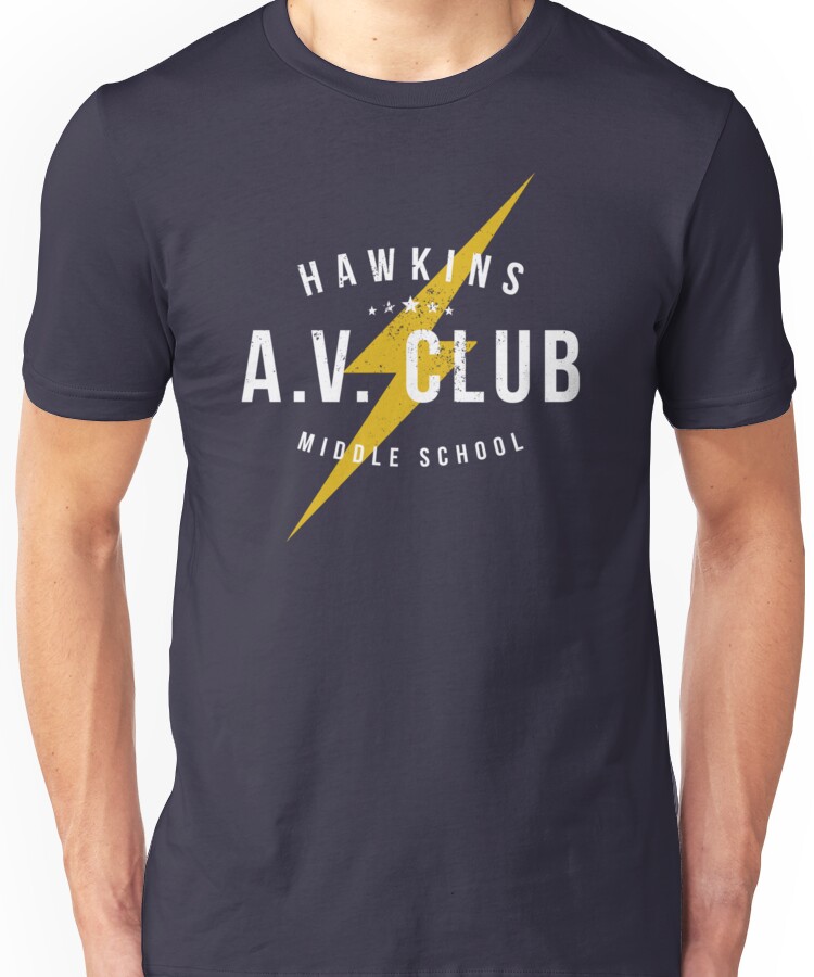from the Artist: Unisex T-Shirt. Hawkins – Middle School – A.V. Club. Inspired by the 2016- television series “”Stranger Things”. Please note that the print is deliberately distressed to give an aged, retro appearance.
