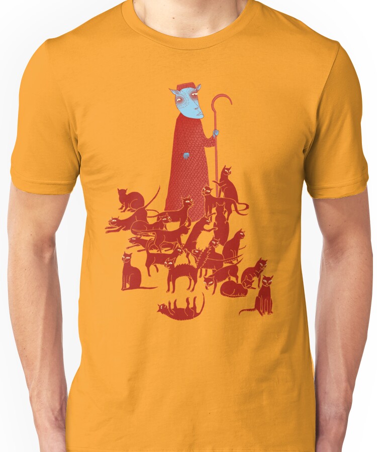 from the Artist: Unisex T-Shirt. I drew this character and then the cats came later. If you would like me to change the background color for a particular item (other than Ts), please shoot me a bubblemail.