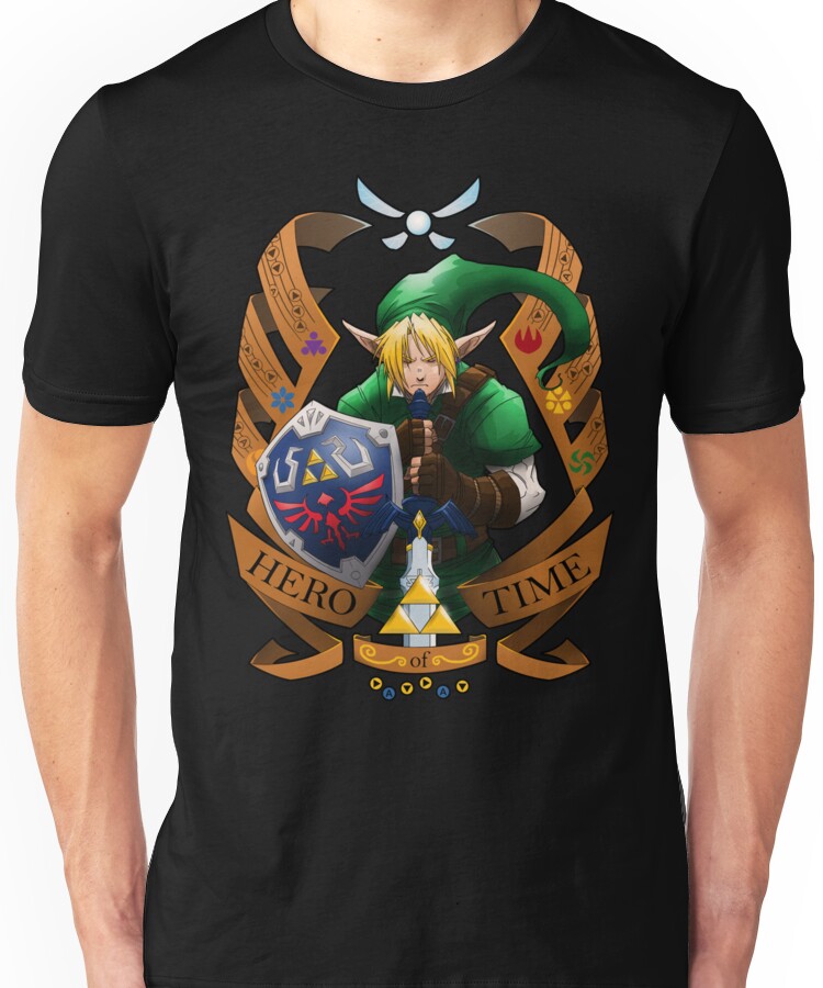 from the Artist: Unisex T-Shirt. The Hero of Time. With the Master Sword at the ready, he shall venture Hyrule and seek the aid of the sages to open a path to Ganon’s castle and stop his rule. [Green Tunic version] (I’ve also added the Blue and Red versions)
