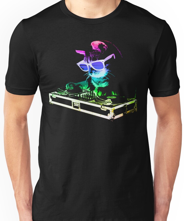 from the Artist: Unisex T-Shirt. Turntable Dejay Kitty Cat in Rainbow Colors Spinning Vinyl LP Records