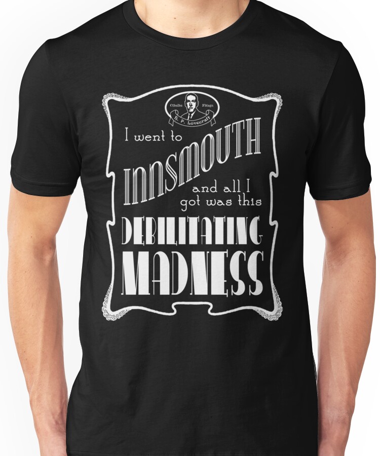from the Artist: Unisex T-Shirt. This H. P. Lovecraft inspired design was inspored by his works (obviously) as well as travel ads from his era all tied together with a bit of silent film flare. Proudly wear it as you descend into the dark depths of the abyss, or to your neighborhood Dagon cultists’ meeting. And as it turns out, RedBubble tees won’t obscure any gills you may be growing.