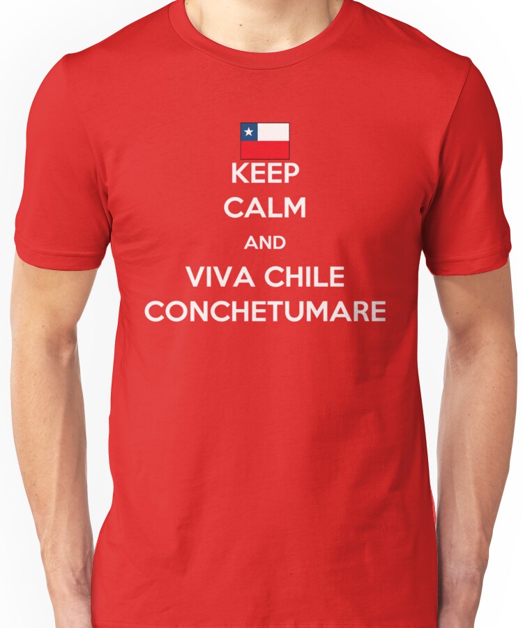 Keep calm and viva Chile conchetumare Unisex T-Shirt NOW $19.99 October 13, 2017 by admin Click Here to Purchase at: $19.99 from the Artist: Unisex T-Shirt.