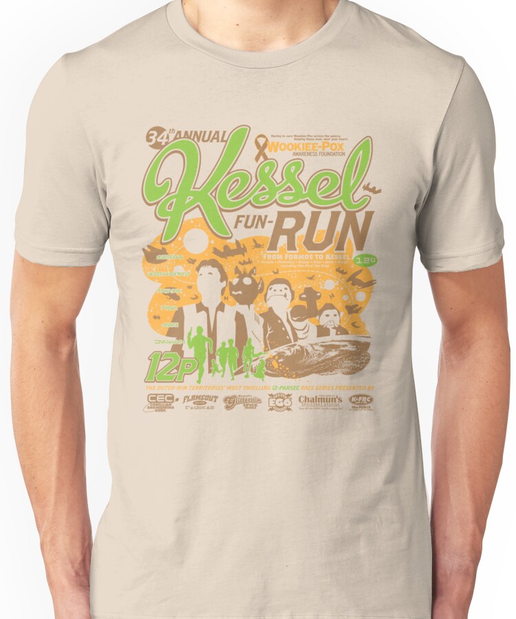 from the Artist: Unisex T-Shirt. *NOTE: This is not an actual race. If it were, you would lose because it is a very long, long way to run and, since it is in space, you would have very poor traction.* _”Racing to cure Wookiee-Pox across the galaxy; Helping those near, near your heart.”_ This is a shirt for the *34th Anniversary 12-Parsec Kessel Fun-Run*. Grab your Glitterstim Spice and help find a cure! Please show your support by showing off these “RIBBONS !http://ih1.redbubble.net/work.6980893.2.sticker,375×360.wookie-pox-awareness-sticker-v1.png!”:http://www.redbubble.com/people/ribman/t-shirts/6980893-2-wookie-pox-awareness-sticker !http://www.sprengelmeyer.com/TeeFury_CaptainRibManInterview11.jpg! “!http://ih1.redbubble.net/image.8853987.0662/fc,60×60,gold.jpg!”:http://www.redbubble.com/people/ribman/t-shirts/5369854-hello-lion-o “!http://ih3.redbubble.net/image.11603876.6152/flat,60×60,075,t.jpg!”:http://www.redbubble.com/people/ribman/t-shirts/6786152-kessel-fun-run-12-parsec-ra