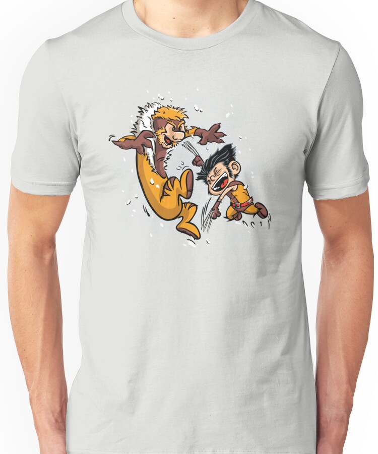 from the Artist: Unisex T-Shirt. A parody of Wolverine and Sabretooth, done in the style of the comic strip Calvin and Hobbes.