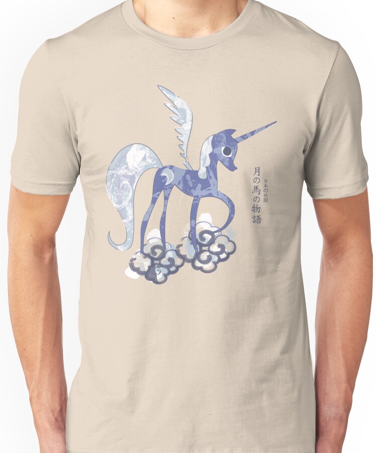 from the Artist: Unisex T-Shirt. This is the Tale of the Moon Horse, a famous Japanese Legend. The protagonist is Luna who ruled over the land with her sister, Celestia. Follow me on these networks to participate in giveaways, get discounts, catch sneak peaks, and submit ideas! !http://www.thisweekinbeer.com/images/tumblr.png!:http://rachaelmakesshirts.tumblr.com !http://cdn.shopify.com/s/files/1/0060/5392/assets/icon-facebook-small.png!:http://www.facebook.com/rachaelmakesshirts !http://gethuman.com/images/twitter25.png!:http://twitter.com/rachaelnthomas !http://bhamterminal.com/files/2012/02/pinterest-logo-241.png!:http://pinterest.com/schemerachael !http://www.governor.ny.gov/assets/images/instagram-icon.png!:http://instagram.com/rachaelmakesshirts Check out the rest of my MLP shirts: !http://ih3.redbubble.net/work.7771558.2.fig,brown,mens,ffffff.chocolate-rain-by-pinkie-pie-v3.jpg!:http://www.redbubble.com/people/dfragrance/t-shirts/7771558-chocolate-rain-by-pinkie-pie !http://ih3.redbu