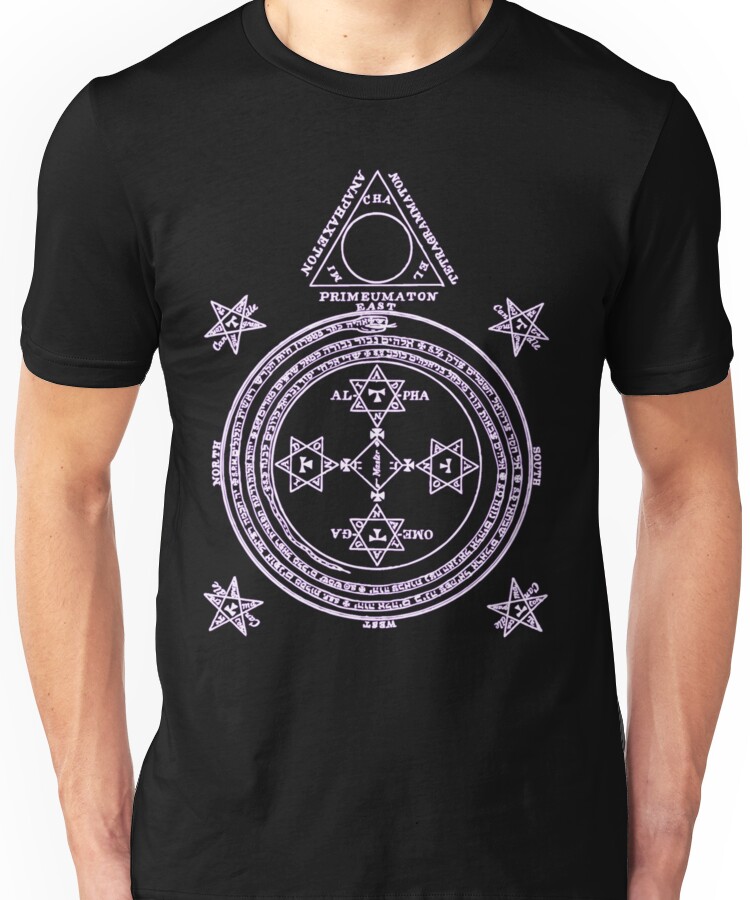 from the Artist: Unisex T-Shirt. BASIC White design for dark coloured shirts – also check out the Duvet / Quilt cover- Call the dark lords in your bedroom! This is the Form of the Magical Circle of King Solomon, the which he made that he might preserve himself therein from the malice of these Evil Spirits. This Magical Circle is to be made 9 feet across, and the Divine Names are to be written around it, beginning at EHYEH, and ending at LEVANAH, Luna. (Colours. – The space between the outer and inner circles, where the serpent28 is coiled, with the Hebrew names written along his body, is bright deep yellow. The square in the centre of the circle, where the word “”Master” is written, is filled in with red. All names and letters are in black. In the Hexagrams the outer triangles where the letters A, D, O, N, A, I, appear are filled in with bright yellow, the centres, where the T-shaped crosses are, blue or green. In the Pentagrams outside the circle, the outer triangles where “”Te, tra, gram, ma, t