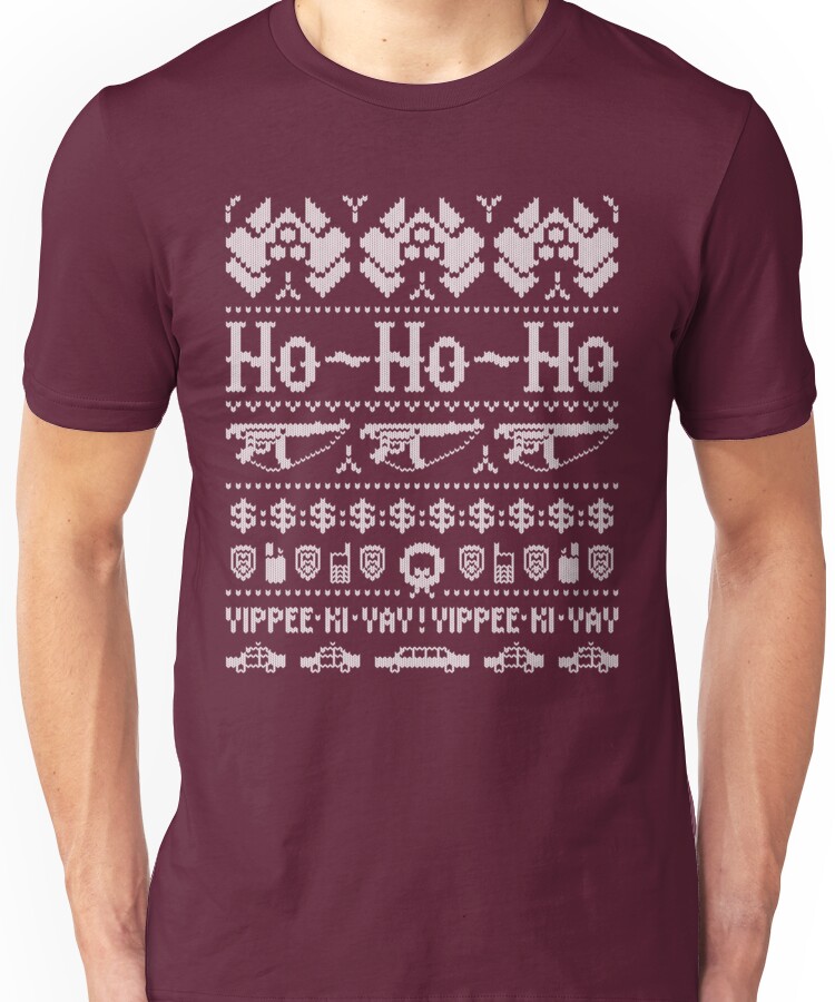 from the Artist: Unisex T-Shirt. A winter sweater take on the greatest Christmas movie ever. An 80’s action celebration of office Christmas parties, hostages, cash and escaping through air ducts – Ho-Ho-Ho – now we can all have machine guns. Yippee Ki Yay! !http://farm7.static.flickr.com/6183/6075999336_971199d536_o.jpg!:http://twitter.com/#!/Seven_Hundred !http://farm7.static.flickr.com/6202/6075999360_541ac8f652_o.jpg!:http://www.facebook.com/groups/110289168995871/ !http://farm7.static.flickr.com/6070/6075999384_768e76960d_o.jpg!:http://www.flickr.com/photos/82202517@N00/ *And don’t forget to upload your pics to the “buyers booth”:http://www.redbubble.com/buyers_booth it’s always nice to see who’s wearing my designs.* !http://farm7.static.flickr.com/6080/6076451086_9235c353d6_o.jpg!:http://www.redbubble.com/people/sevenhundred/portfolio