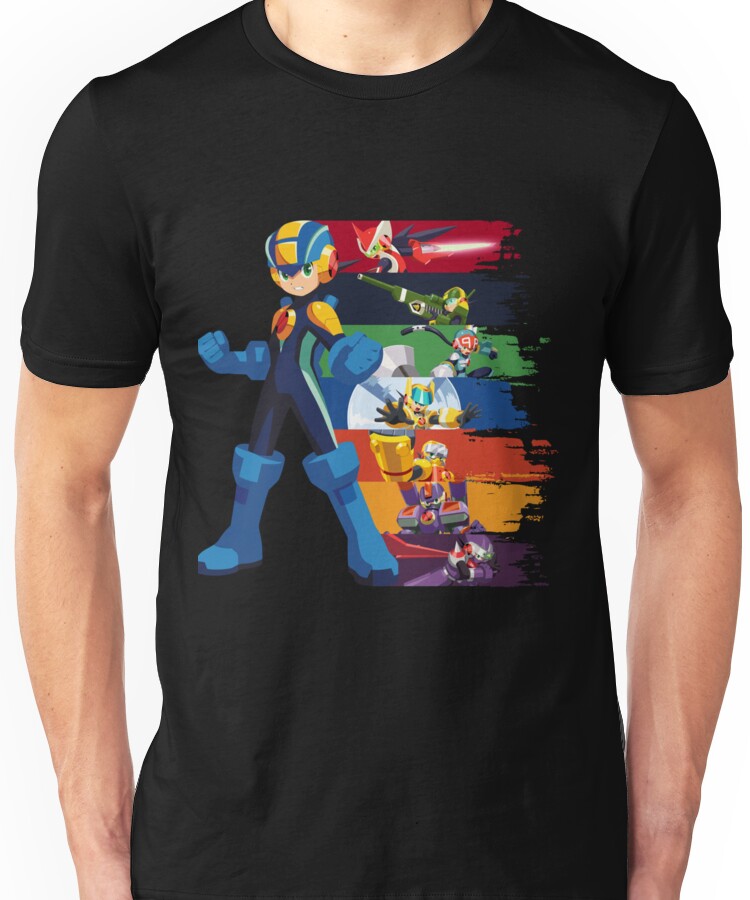 from the Artist: Unisex T-Shirt. A new version of my previous semi-minimalist design now fleshed out with greater detail! [http://www.redbubble.com/people/jax89man/works/10091120-megaman-souls-of-a-hero-v2]