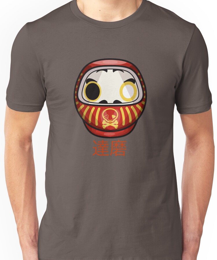 from the Artist: Unisex T-Shirt. mikoto’s Daruma Doll !http://www.mikoto.com.au/images/daruma300.png!:http://www.mikoto.com.au someone asked me at my stall at “Paddington Markets”:http://mikoto.com.au/2007/10/05/mikoto-at-sydneys-paddington-markets-every-saturday/ about the meaning behind the skull logo. I talked to them about how I wanted to achieve a balance between cuteness and evil/cheeckyness in all of the mikoto designs. Having the skull and cross bones with love heart eyes and a cute smile symbolized that. I also talked about how having one eye coloured related to the Japanese Daruma Doll. The Daruma is a Japanese doll that is sold near Buddhist temples all throughout Japan. It symbolises optimism, persistence, and strong determination because of its ability to be tilted to one side and always return to the upright position. The doll’s eyes only contain the color white. Using black ink, you fill in a single eye while thinking of a wish. If the wish comes true, the second eye is