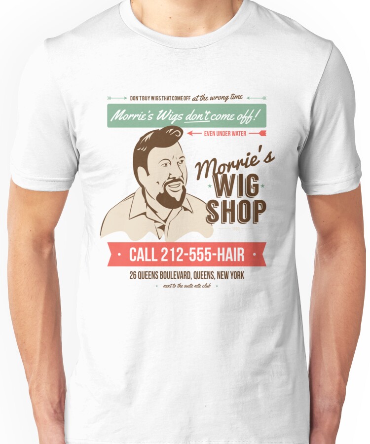 from the Artist: Unisex T-Shirt. You’re not going to get a finer wig that one of Morrie’s. They don’t come off, even under water! This fictional business from the 1990 movie Goodfellas had one of the best infomercials ever. Morrie’s wigs are tested under hurricane conditions!