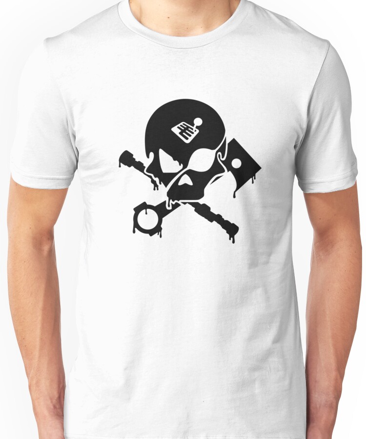 from the Artist: Unisex T-Shirt. Oily Skull, Camshaft, Pistons and an eyepatch. Everything a Motorsports Pirate needs. Design is from our 2008 Design Contest.