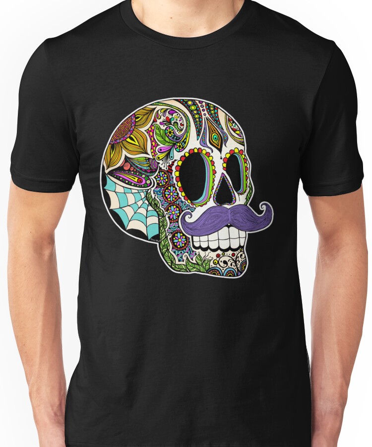 from the Artist: Unisex T-Shirt. Hand drawn ink illustration of a Day of the Dead sugar skull sporting a spiffy mustache! Great mustache design for all of your hairy lipped guy friends! This is the color version – there is also a black and white version, so check out all of the available designs and products.